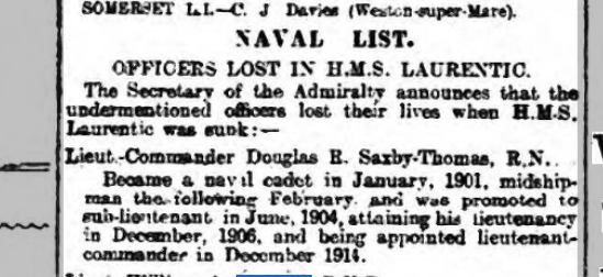 In loving memory of Lieut. Com. DOUGLAS ROSCOE SAXBY-THOMAS. R.N. H.M.S. Venerable The Second dearly loved son of Mr. and Mrs. G.E. Thomas of the Indian Public Works Dept. Who lost his life when H.M.S. Laurentie was sunk in the Irish Sea 25th January 1917. “He laid down his life for noble cause and passed unafraid to GOD” This Memorial has been erected by his Mother and Father and his two Brothers Capt. H.G. Saxby-Thomas R.E. and Lieut. N.H. Saxby-Thomas R.F.A.