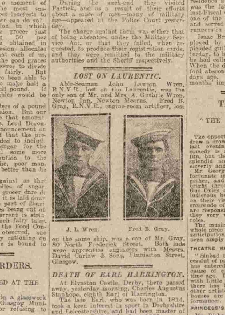 A notice of his death, along with a photograph, and that of his fellow apprentice engineer John Lawson Wren, appeared in the Daily Record, Tuesday 6th February 1917.