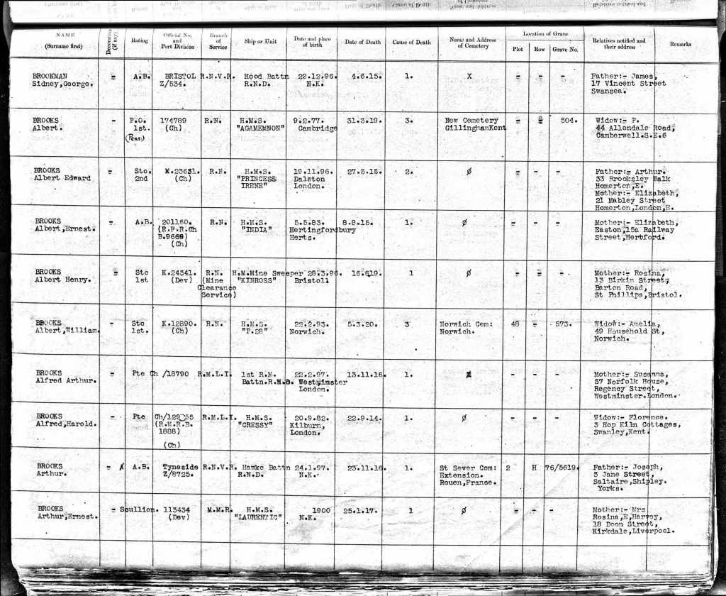 Arthur Ernest Brooks is commemorated on the memorial at St Lawrence’s C of E Church Kirkdale and on the Merseyside Roll of Honour (Service number: 113434). Body Not Recovered For Burial.